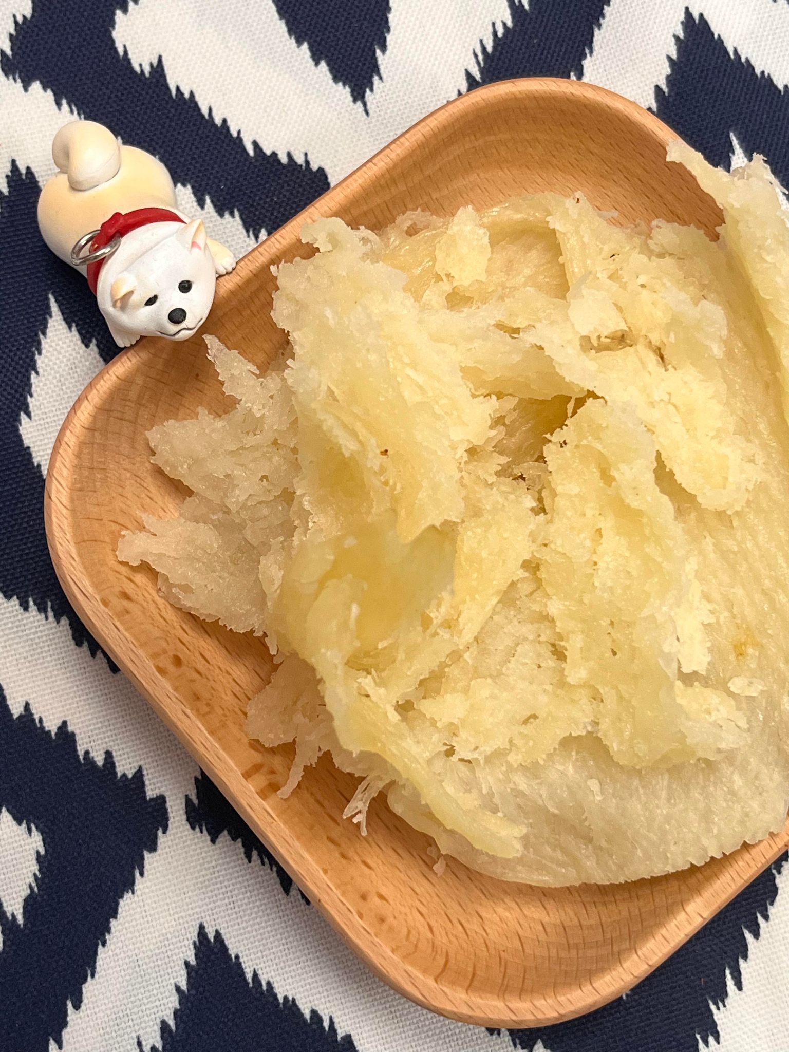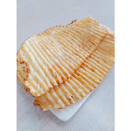 新鮮魚漿與小麥粉拌製而成,雖然是鮭魚魷卷片,但是聞起來不會有鮭魚的腥味,反而有淡淡的起司香